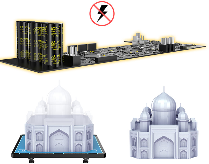 Встроенный аккумулятор и память позаботятся о том, чтобы сопло 3D-принтера было отведено в сторону при отключении электропитания, благодаря этому модели будут застрахованы от повреждения из-за слишком высокой температуры сопла.
